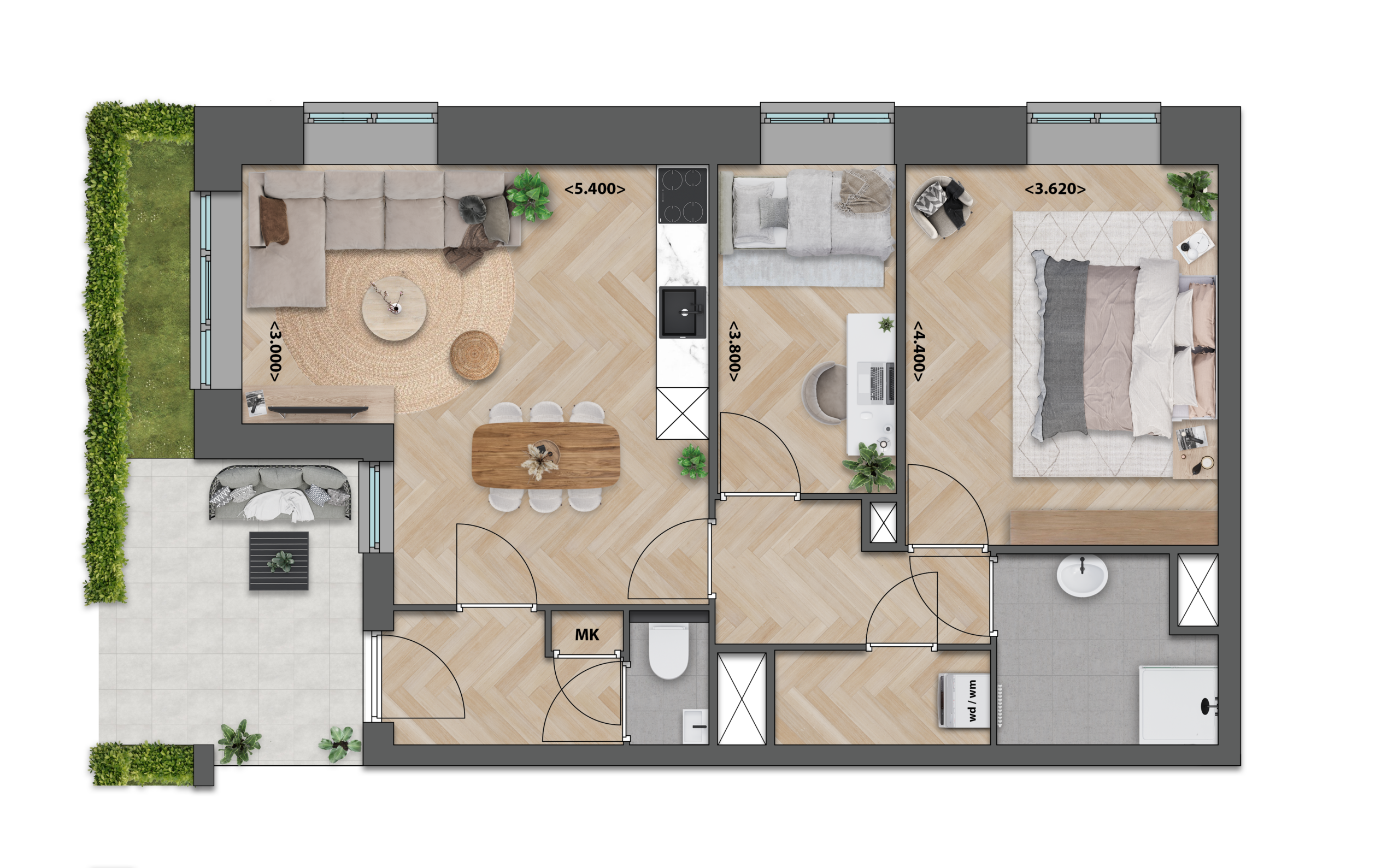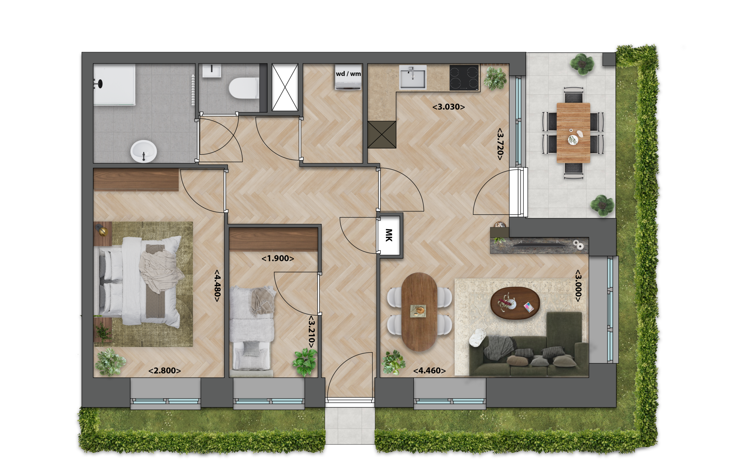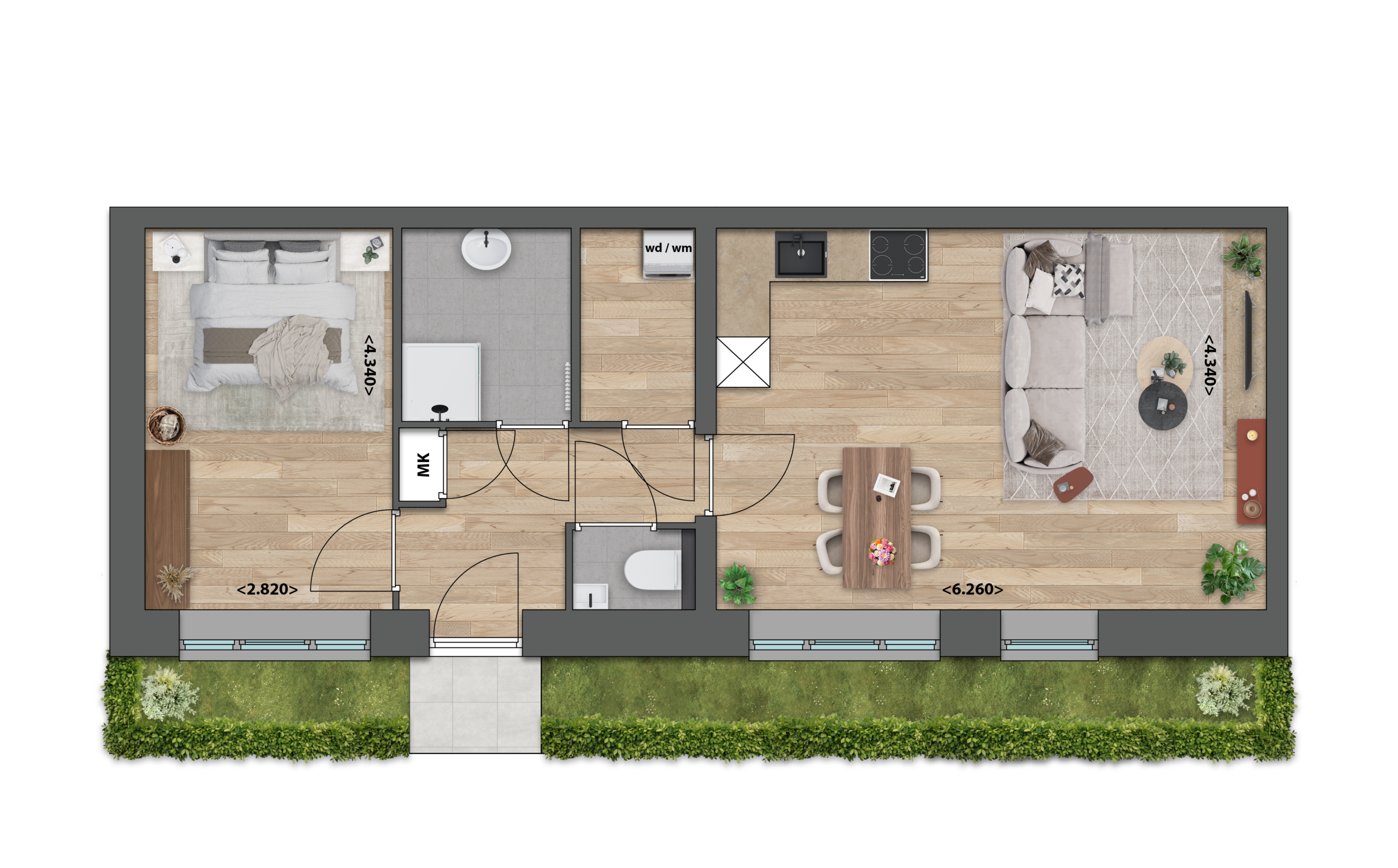 Deze appartementen op de begane grond hebben een prettige, overzichtelijke indeling met twee slaapkamers en een fijn terras naast de voordeur. De gezellige, compacte woonkamer biedt voldoende ruimte voor een comfortabele zit- en eethoek. Door het mooi verspreide daglicht voelt de woning warm, rustig en prettig aan.