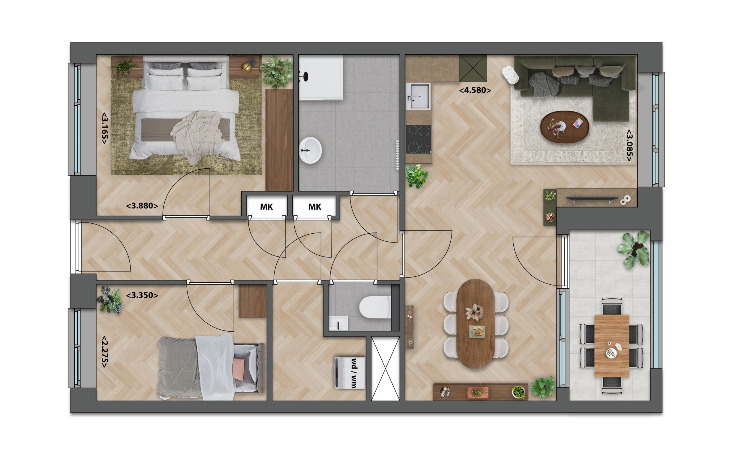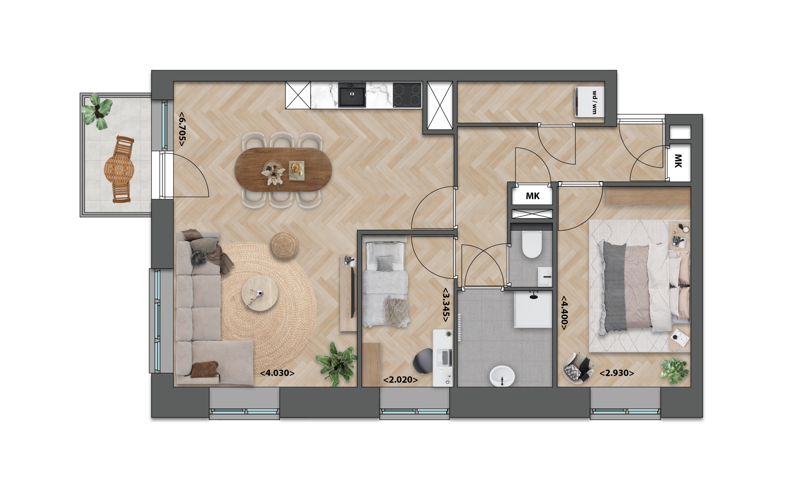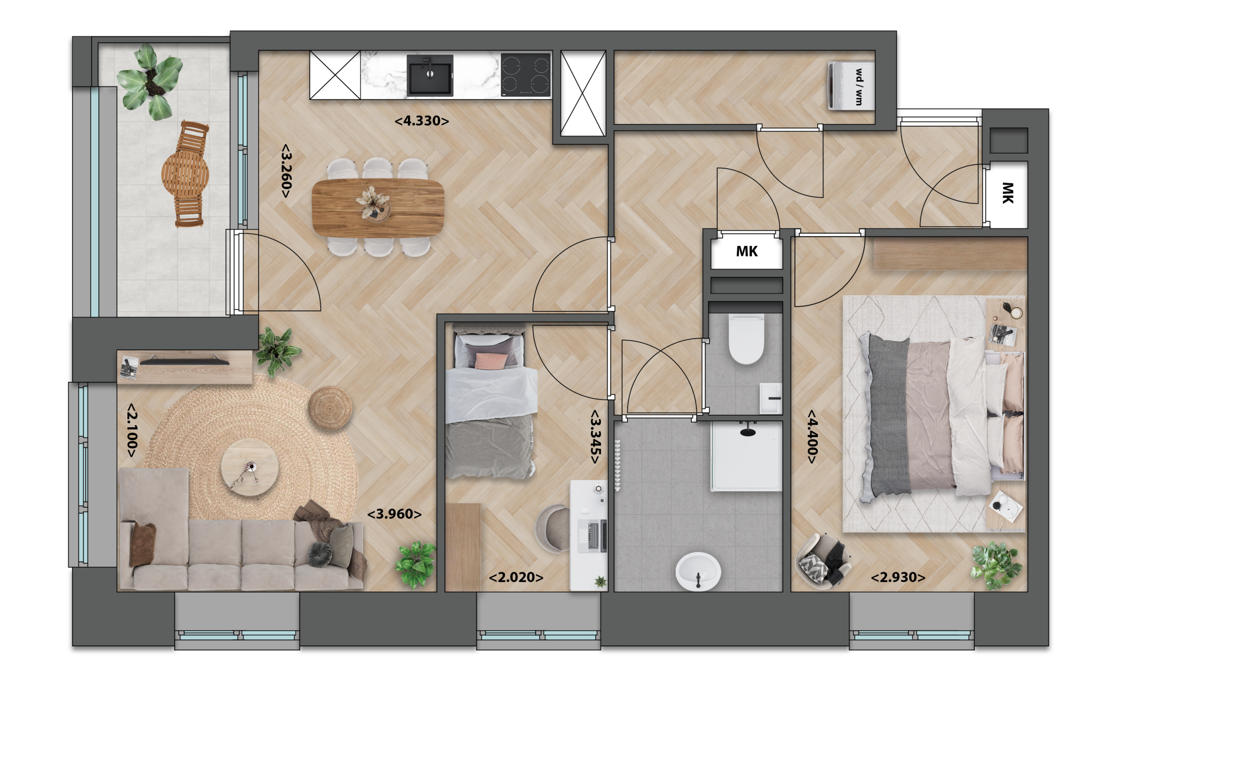Deze appartementen op de derde, vierde of vijfde verdieping hebben een ruime, lichte woonkamer met open keuken die prettig centraal in de woning ligt. De twee compacte slaapkamers zijn handig ingedeeld, zodat je ze optimaal kunt benutten. Aan de voorzijde, direct bij de keuken, bevindt zich een gezellig balkon dat een fijn extra plekje buiten biedt.