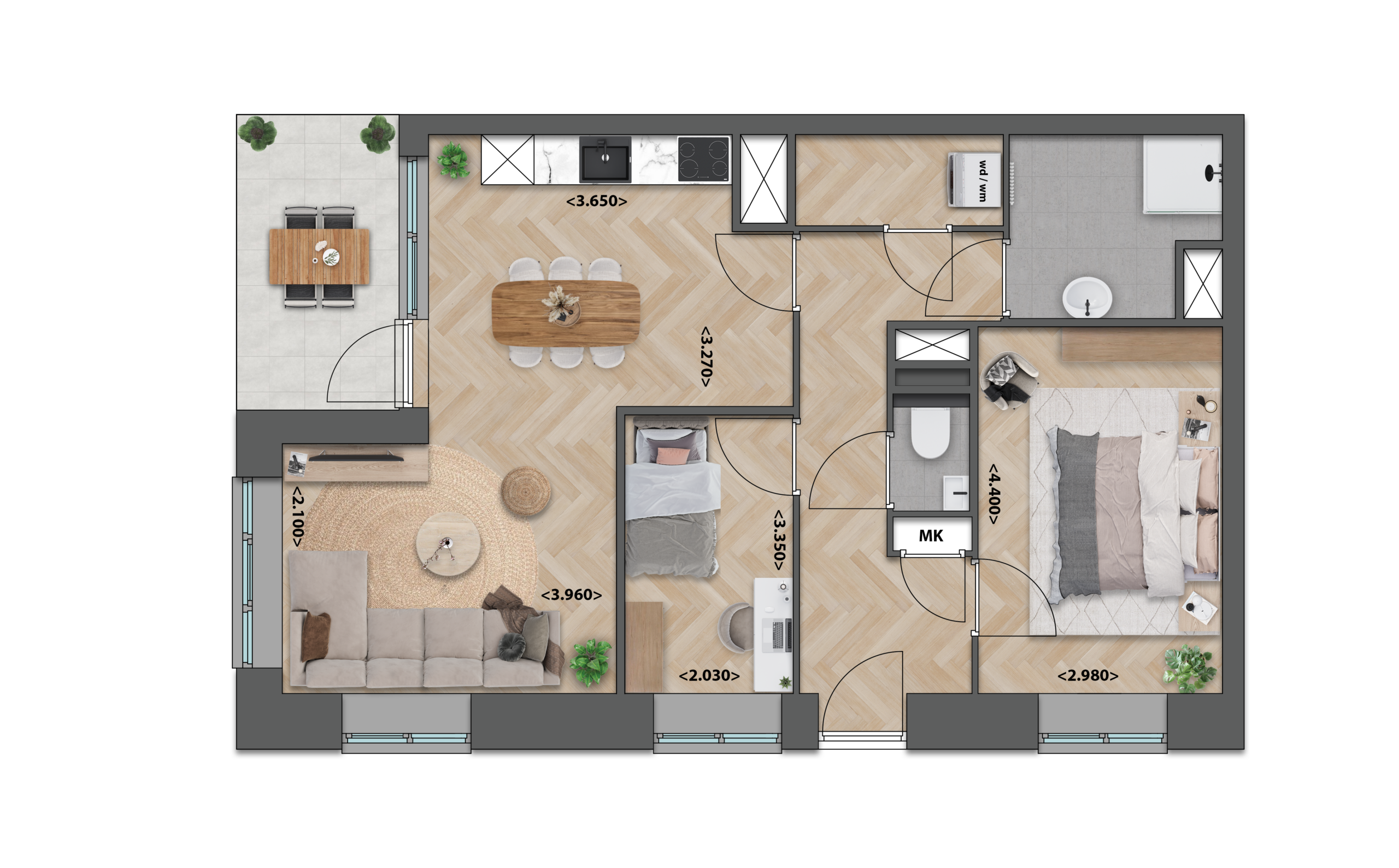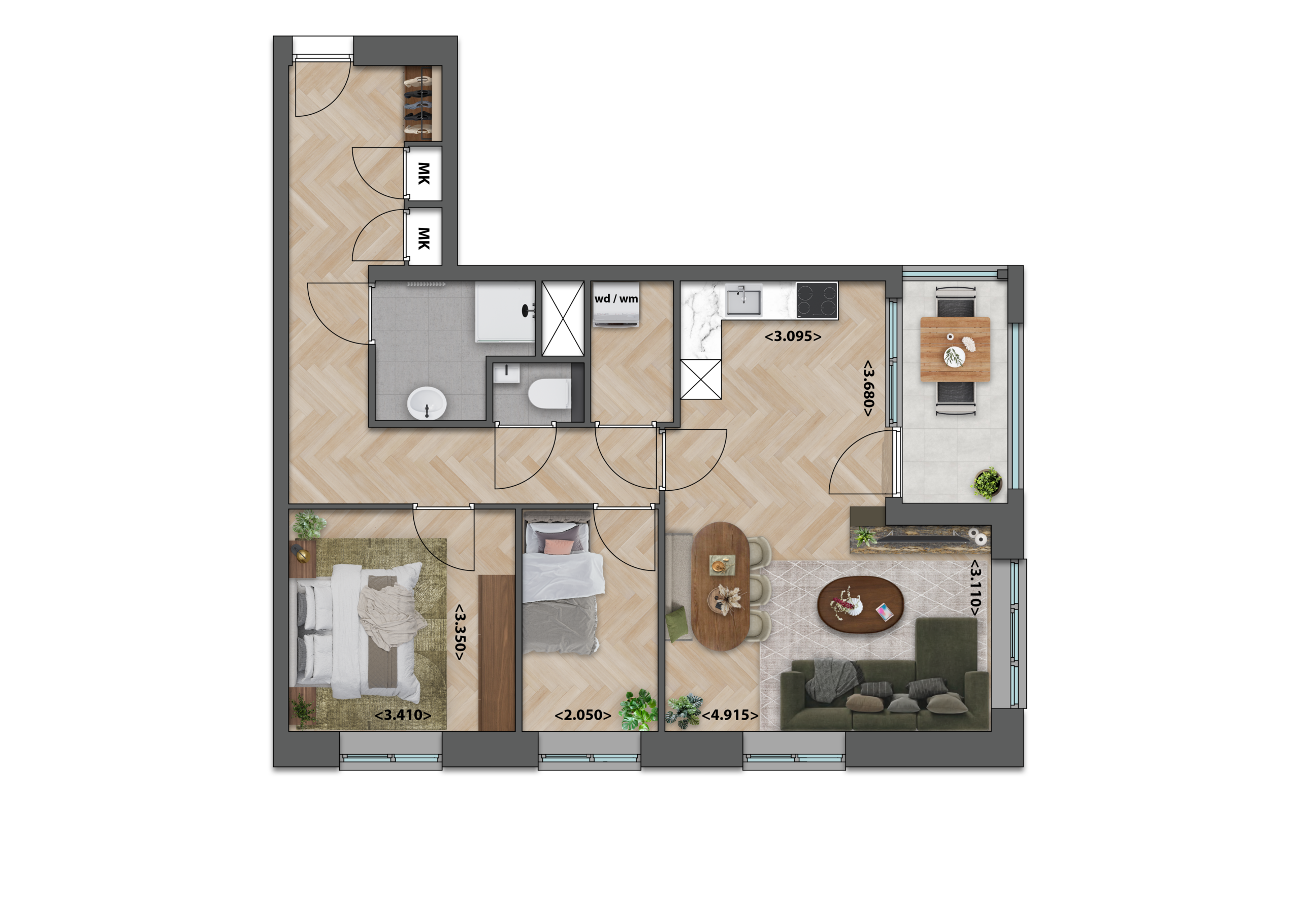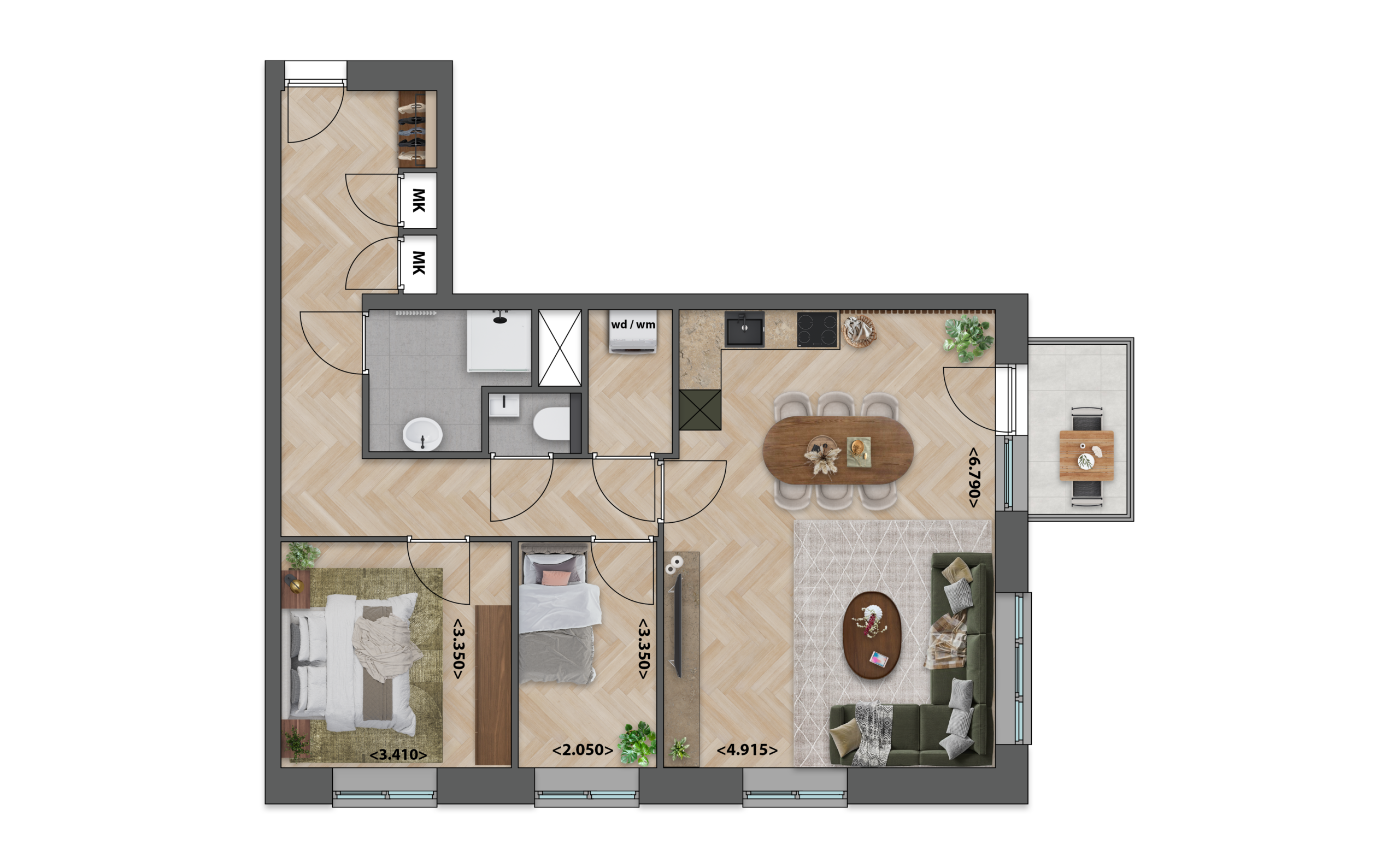 Deze appartementen op de derde, vierde of vijfde verdieping hebben een ruime, lichte woonkamer met open keuken die prettig centraal in de woning ligt. De twee compacte slaapkamers zijn handig ingedeeld, zodat je ze optimaal kunt benutten. Aan de voorzijde, direct bij de keuken, bevindt zich een gezellig balkon dat een fijn extra plekje buiten biedt.