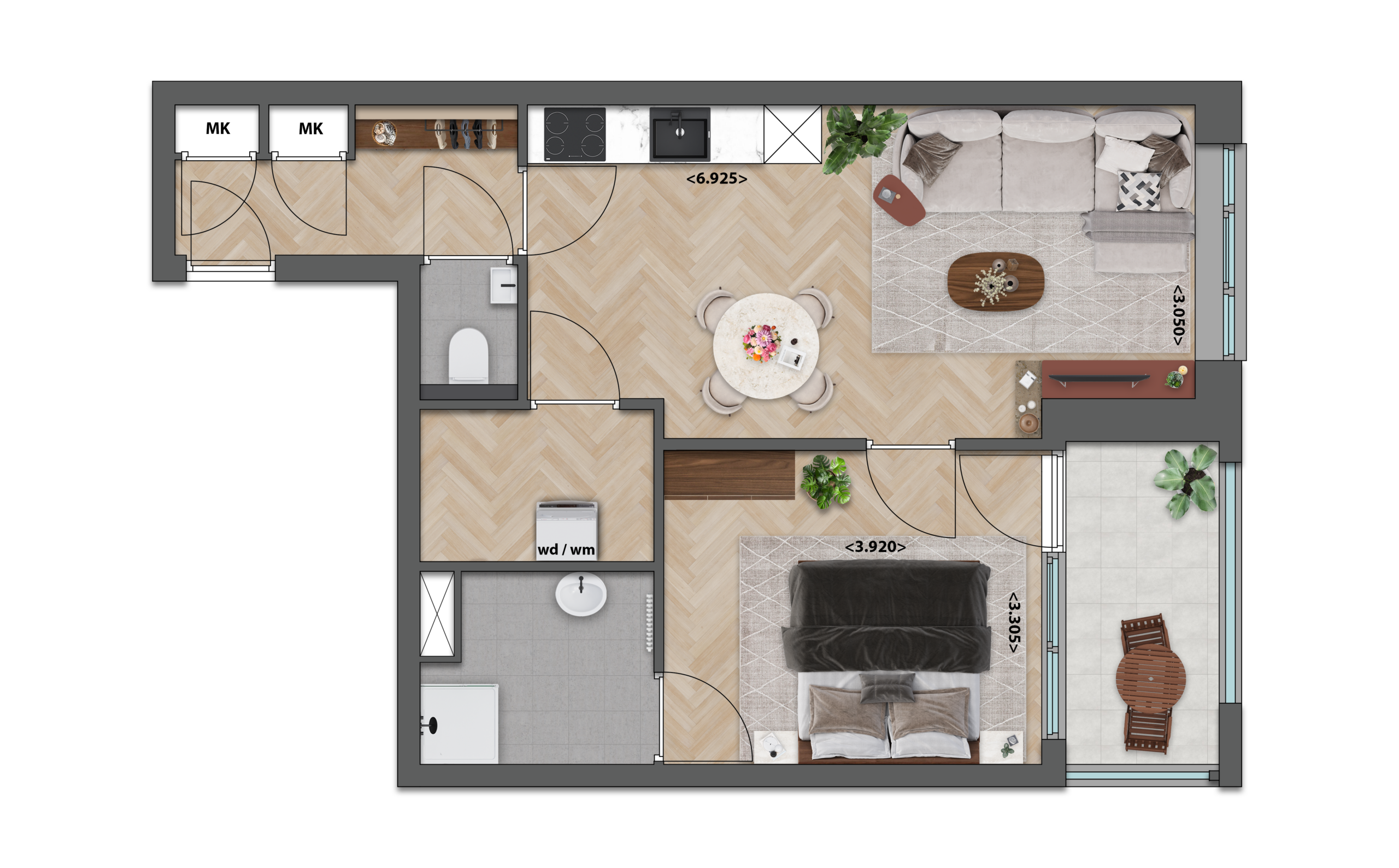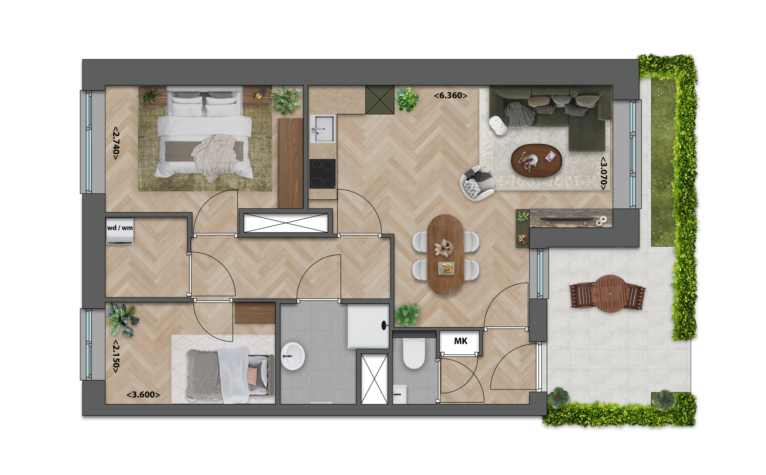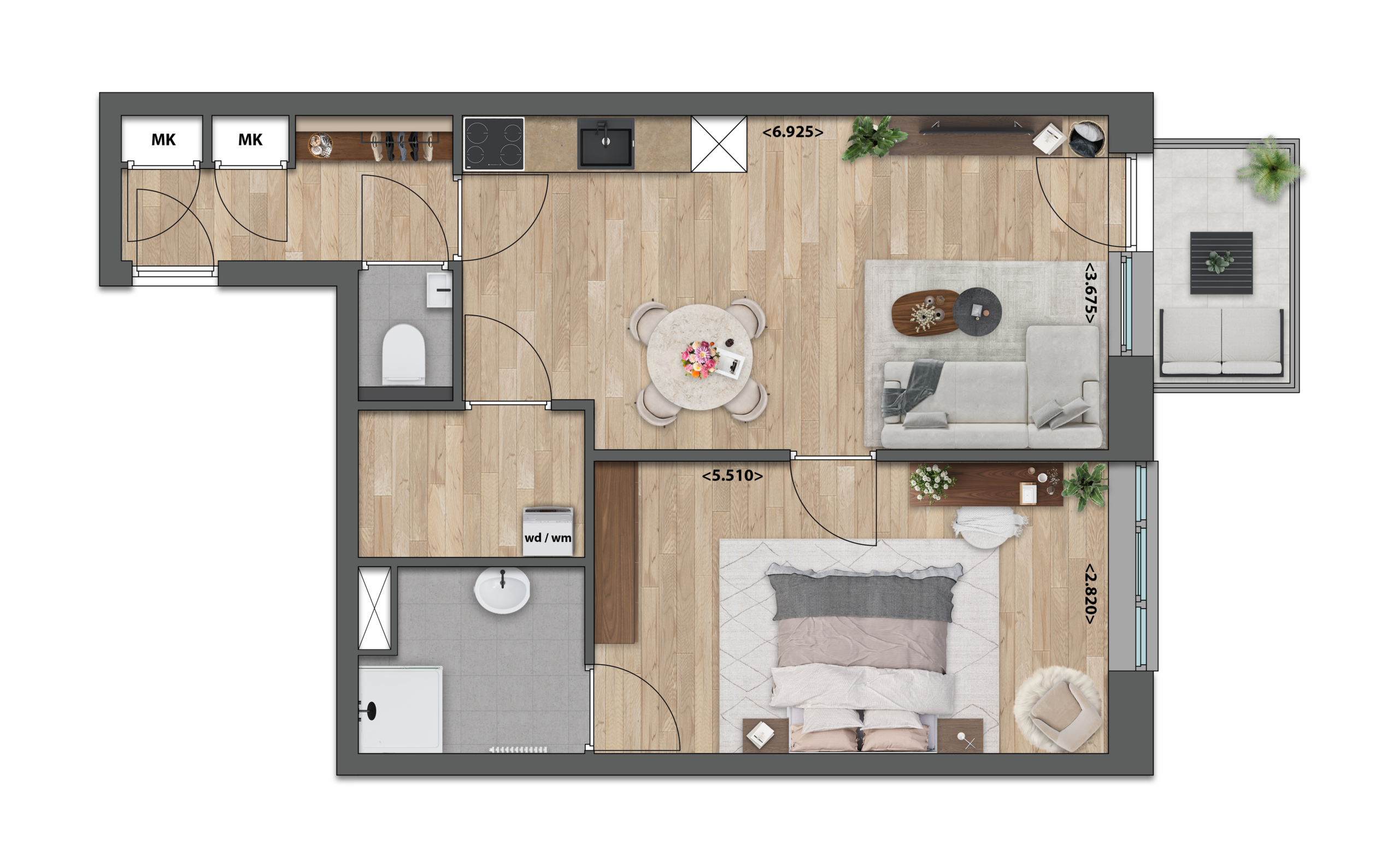 Deze appartementen op de eerste verdieping hebben een lichte woonkamer met een open keuken die fijn en natuurlijk doorloopt naar het balkon aan de buitenzijde. De twee comfortabele slaapkamers zorgen ervoor dat het geheel compleet en ontspannen voelt. De ruime badkamer zorgt voor een ultiem wooncomfort.